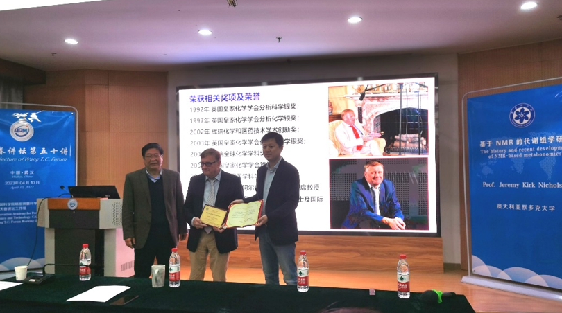 4月10日,evo真人视讯举行“王天眷讲坛”第五十讲。来自澳大利亚Murdoch大学的教授Jeremy K. Nicholson应邀为广大师生做题为“NMR波谱与分子表型”的精彩学术报告。此次报告由刘买利院士主持,evo真人视讯院长周欣为Nicholson教授颁发了“王天眷讲坛讲席教授”的聘书和铭牌,evo真人视讯师生聆听了此次报告。